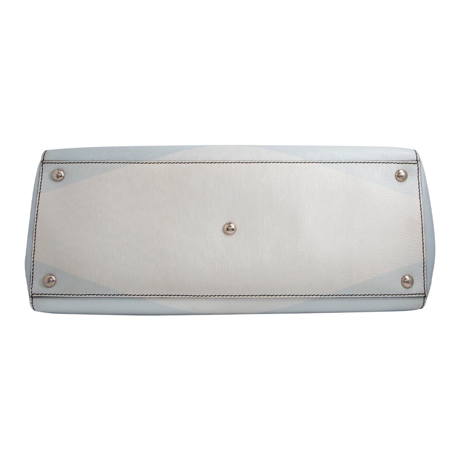 Material exterior: Piel con degradado en tonos azules con efecto geométrico en franjas que van desde el azul marino hasta un azul claro casi blanco.