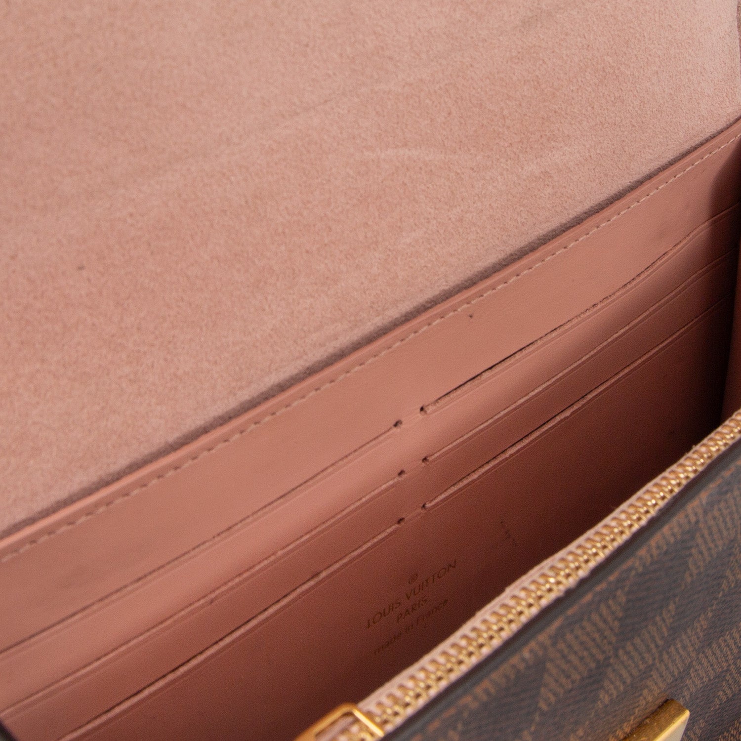 Material exterior: Lona Damier Ebene y piel en color rosa.