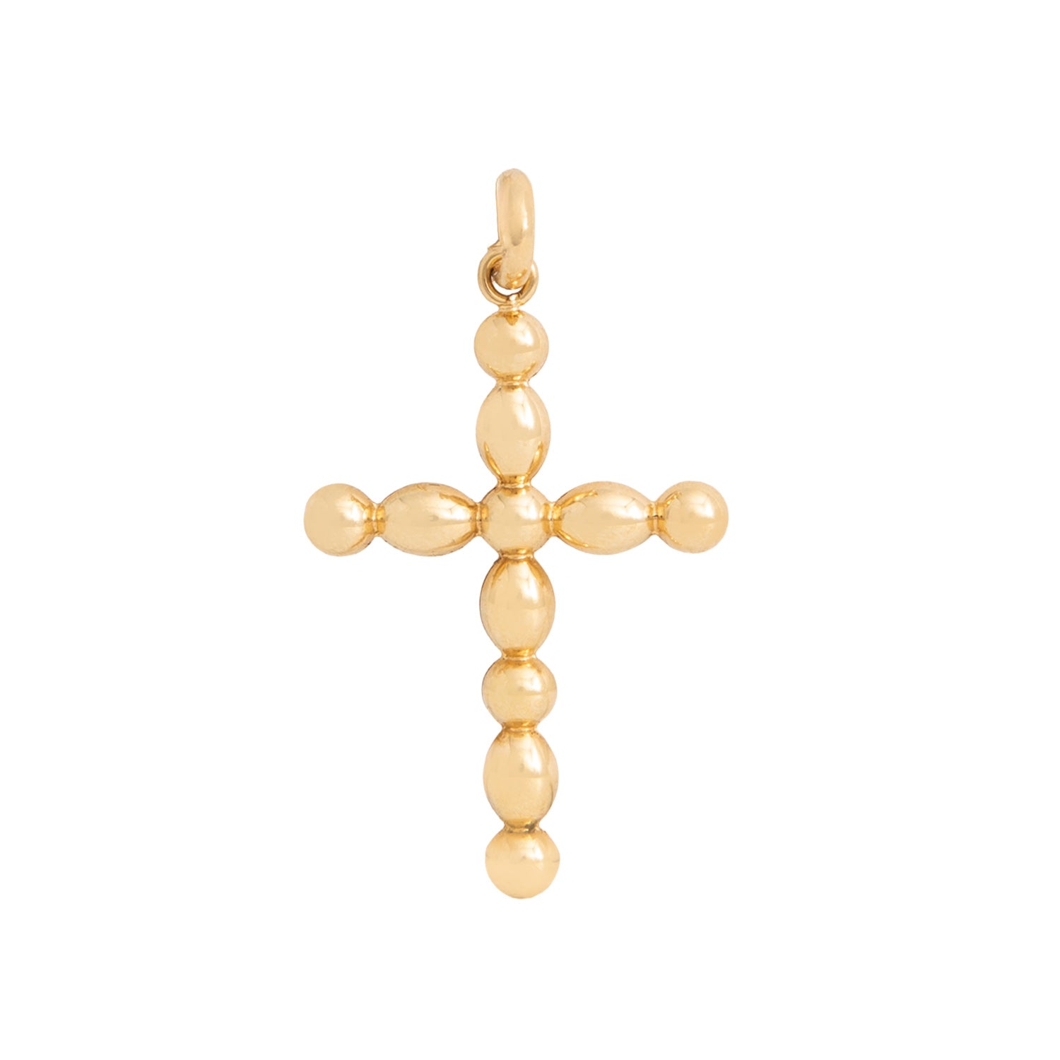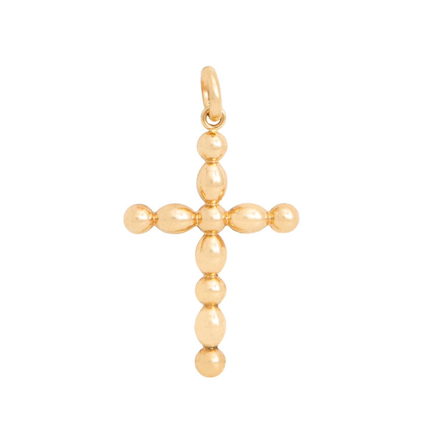 Material: Elaborado en oro amarillo 18k con motivo de cruz formado por esferas y óvalos pulidos.