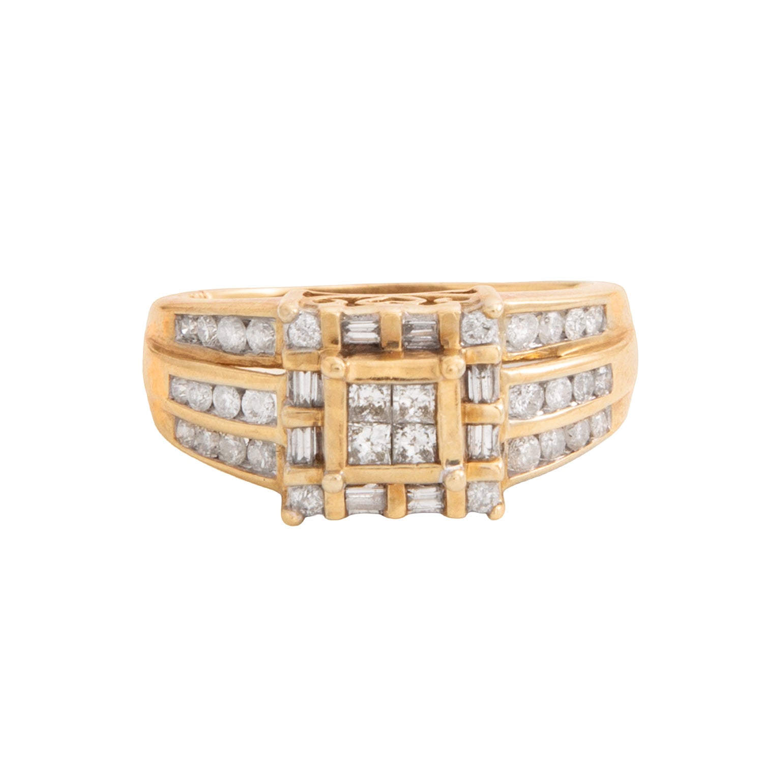 Piedras: 4 chispas de diamante corte princess de 0.05 CT, 8 chispas de diamante corte baguette de 0.01 CT, 28 chispas de diamante de 0.02 CT.