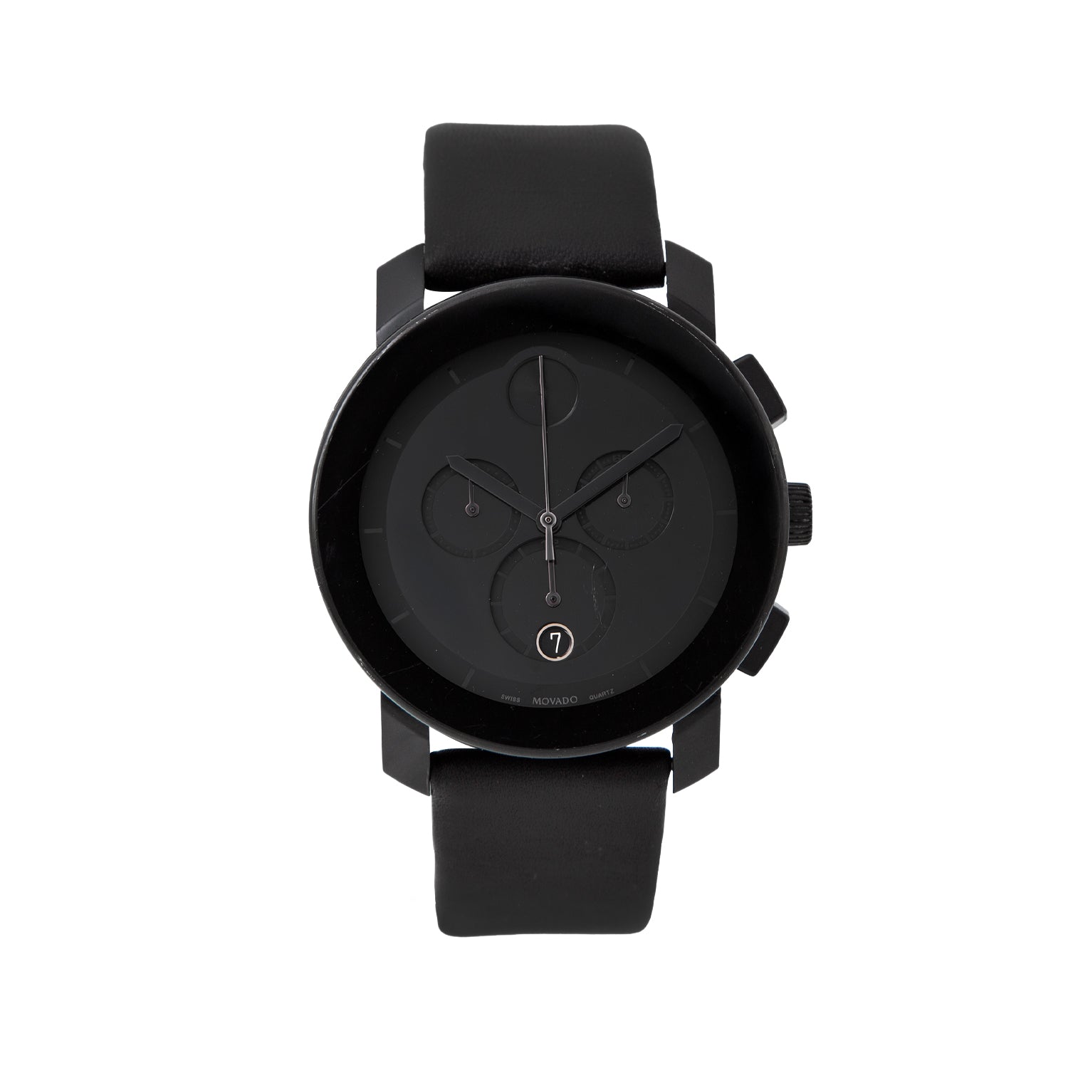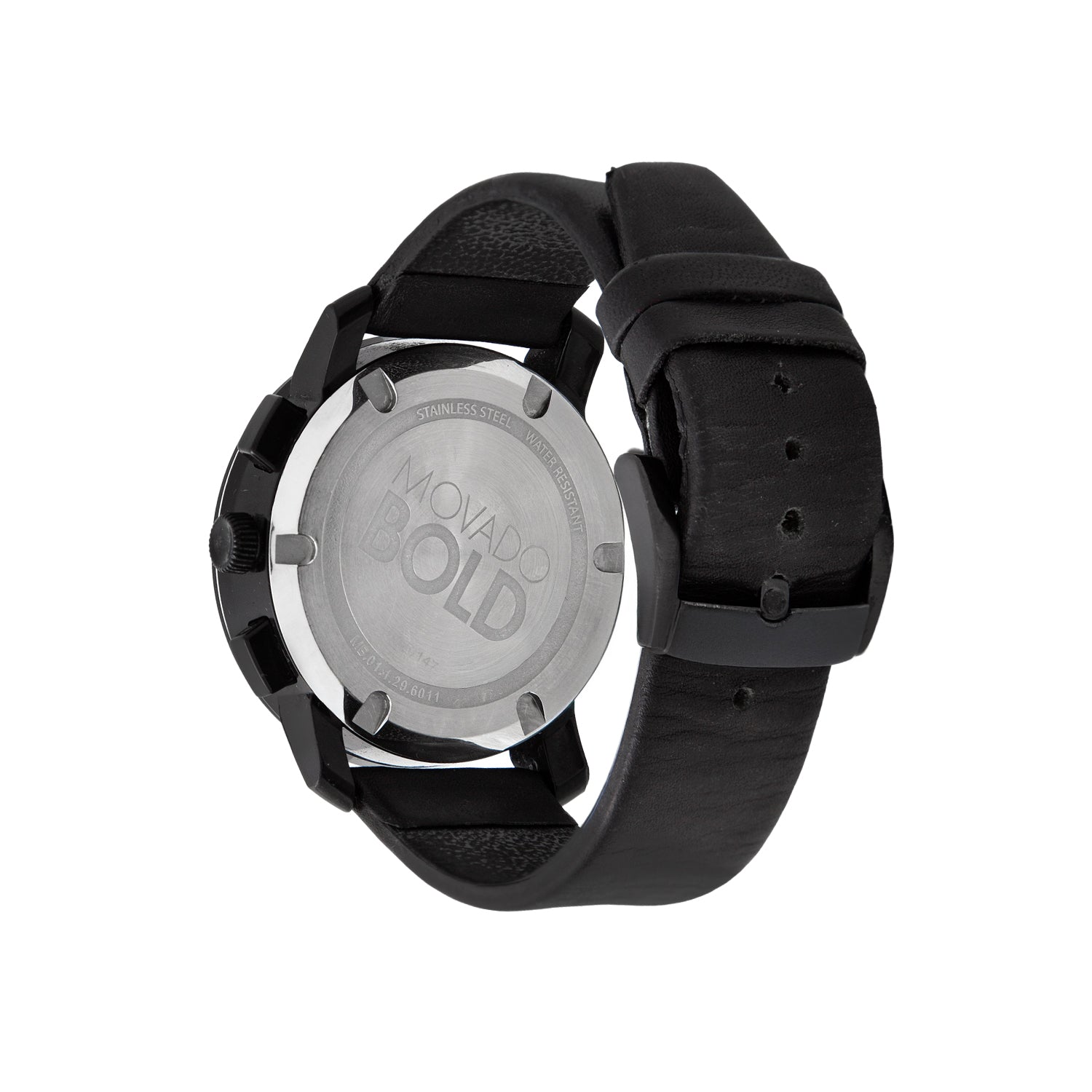 Carátula: Negra estilo "sunray", presenta el icónico punto cóncavo de Movado a las 12 en punto, manecillas e índices negros luminiscentes. Incluye tres subesferas de cronógrafo y una ventana de fecha a las 6 en punto.