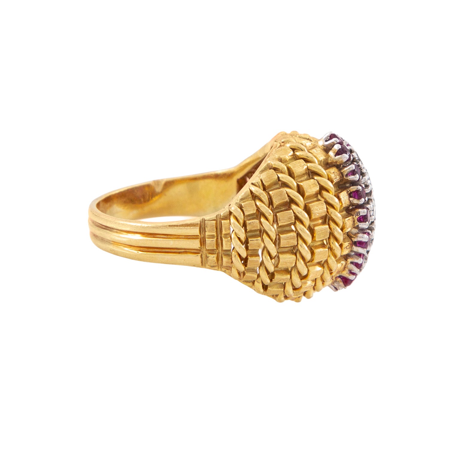 Piedras: Rubíes, un diamante central de .06 CT, dos diamantes de .03 CT y dos diamantes de .02 CT.