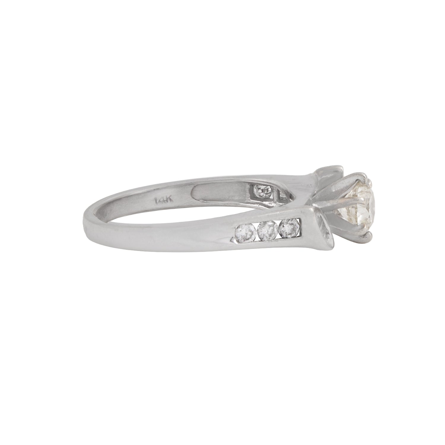 • Piedras: Diamante central redondo de .45 CT, color L, claridad SI1. A los lados 6 chispas de diamante y chispas corte baguette.