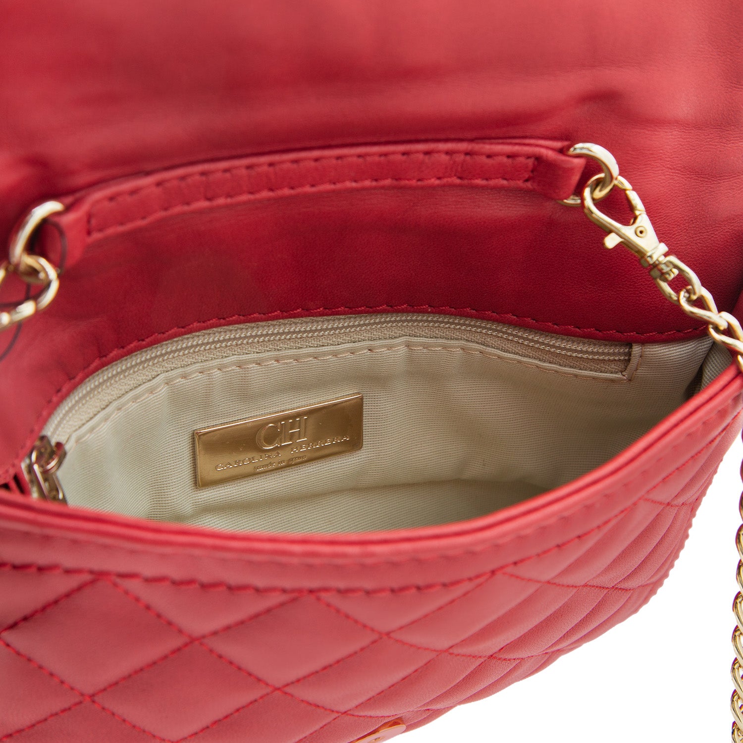 Material exterior: Piel en color rojo con patrón repetitivo de las iniciales "CH" en relieve sobre toda la superficie.
